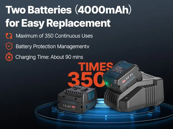 Comes with two 4000mAh lithium batteries for easy replacement. Full charge supports 300–450 continuous uses, with charge/discharge management for more secure operation.