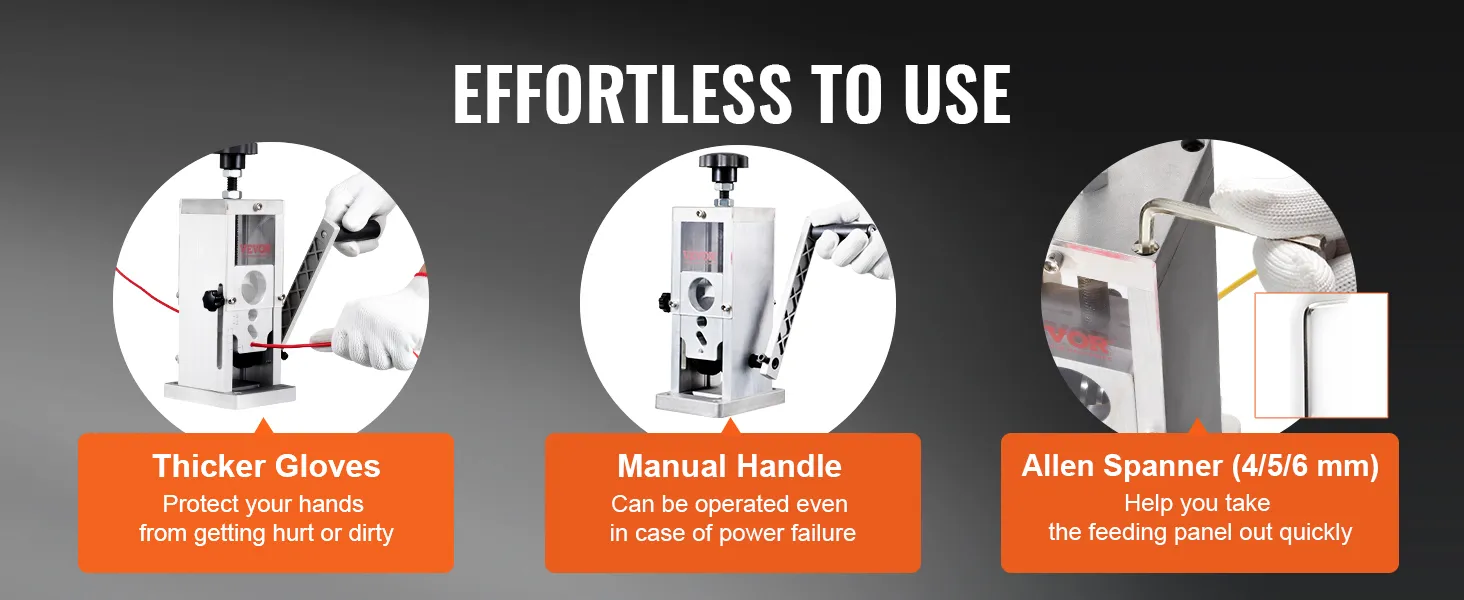 Úplné zameranie je vaše: Pripravte sa na to, že vás uchváti! Odizolovací stroj VEVOR má 4 odizolovacie otvory. Nastavte čepeľ tak, aby vyhovovala všetkým drôtom s priemerom od 0,06'' (1,5 mm) do 1,5'' (38 mm). Je to také jednoduché! Vhodné na manipuláciu s drôtmi s tvrdým krytom, drôtmi s mäkkým krytom, viacvodičovými drôtmi, monovláknovými drôtmi atď. Ste pripravení?